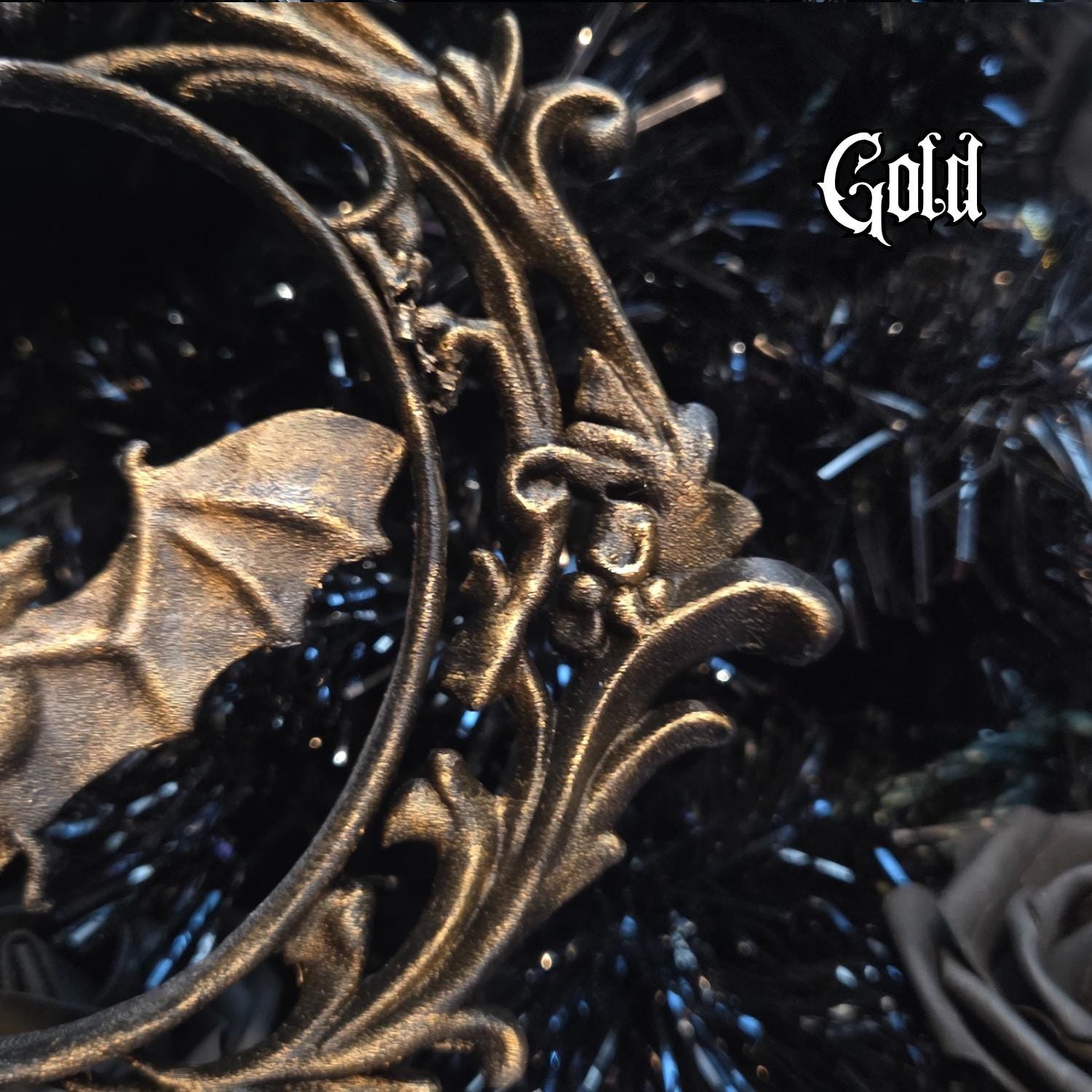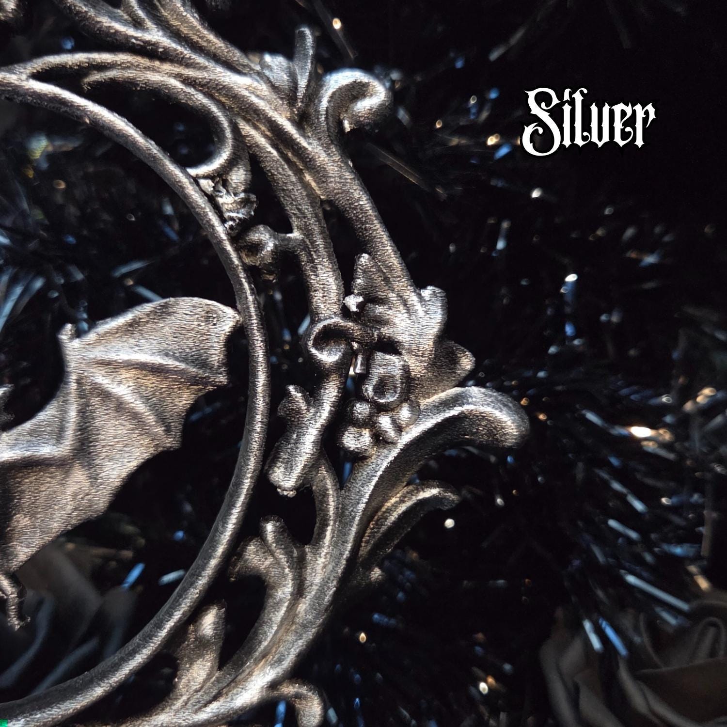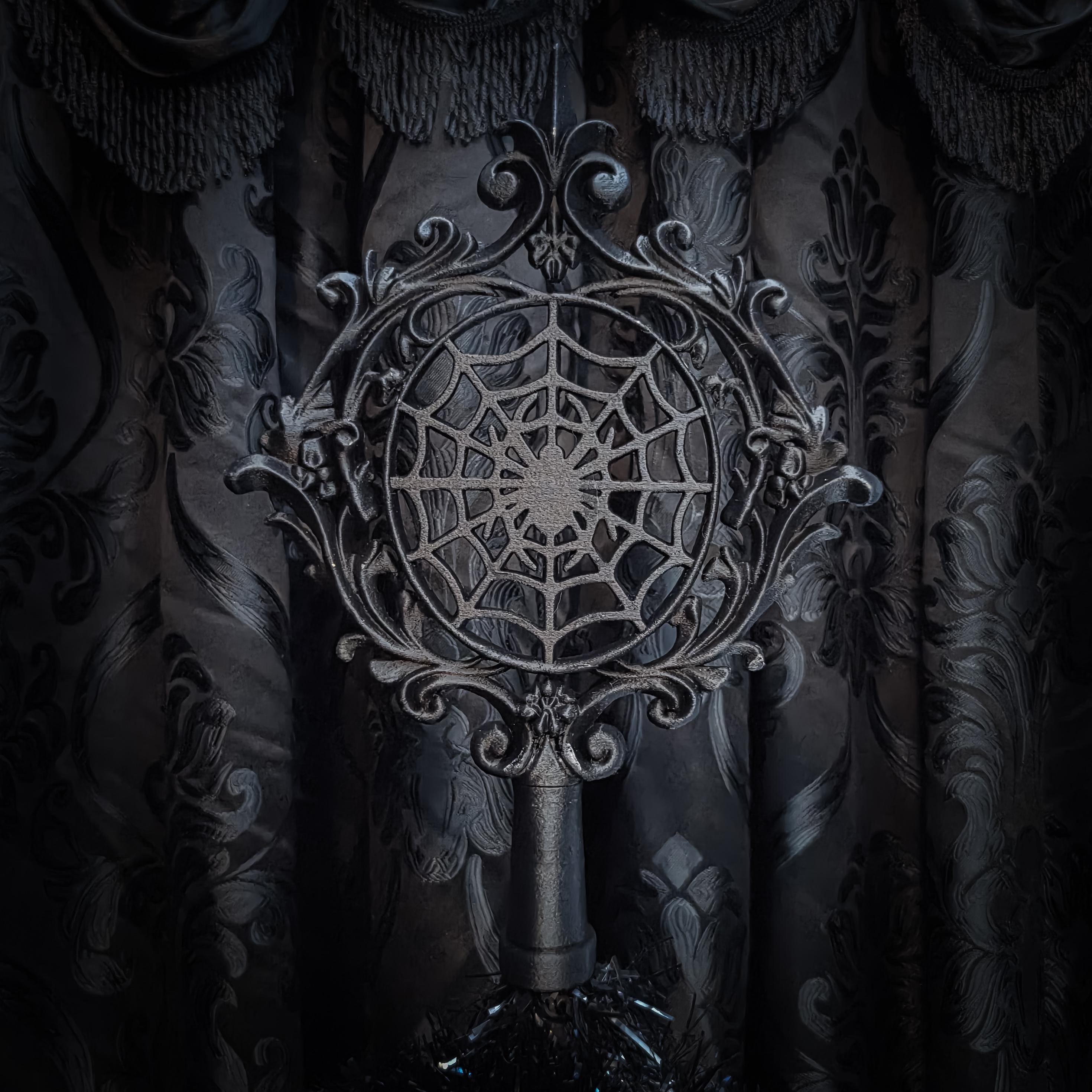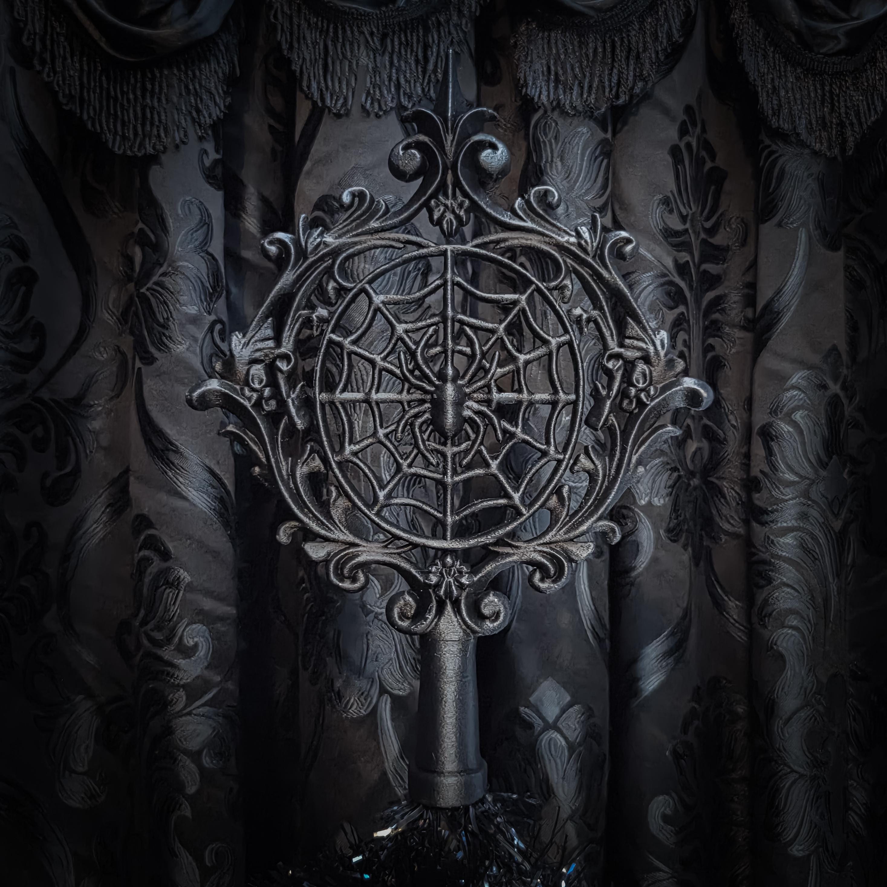 Crown your tree with a touch of dark elegance using this baroque-style Victorian tree topper, designed to mimic the rich texture of cast iron. The ornate filigree frame surrounds a spider waiting on a web for its next meal, creating a centerpiece that feels both timeless and unmistakably gothic. Available in classic black iron or hand-painted in antiqued pewter, silver, or gold. A perfect way to finish your Christmas Mourning display with distinctive style.