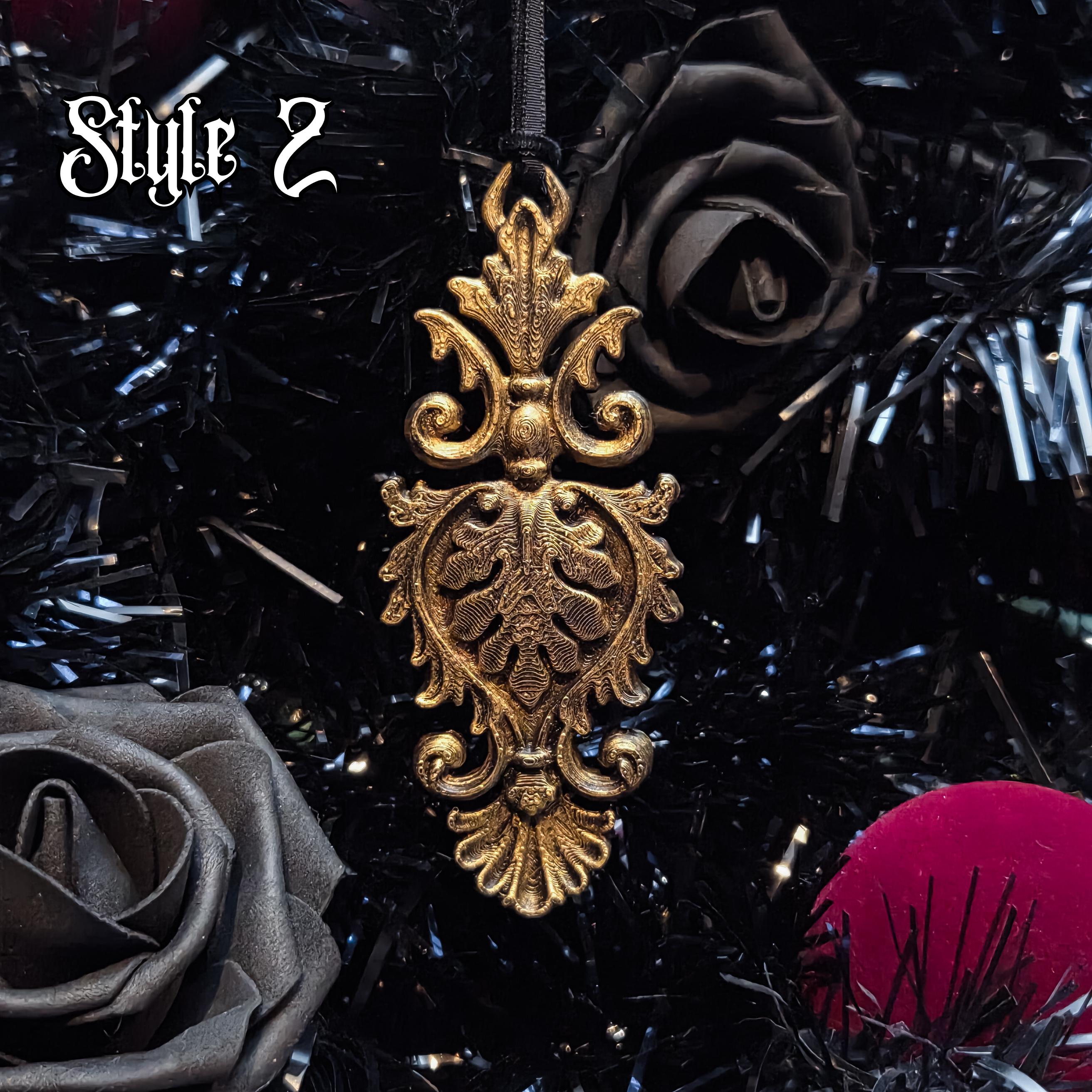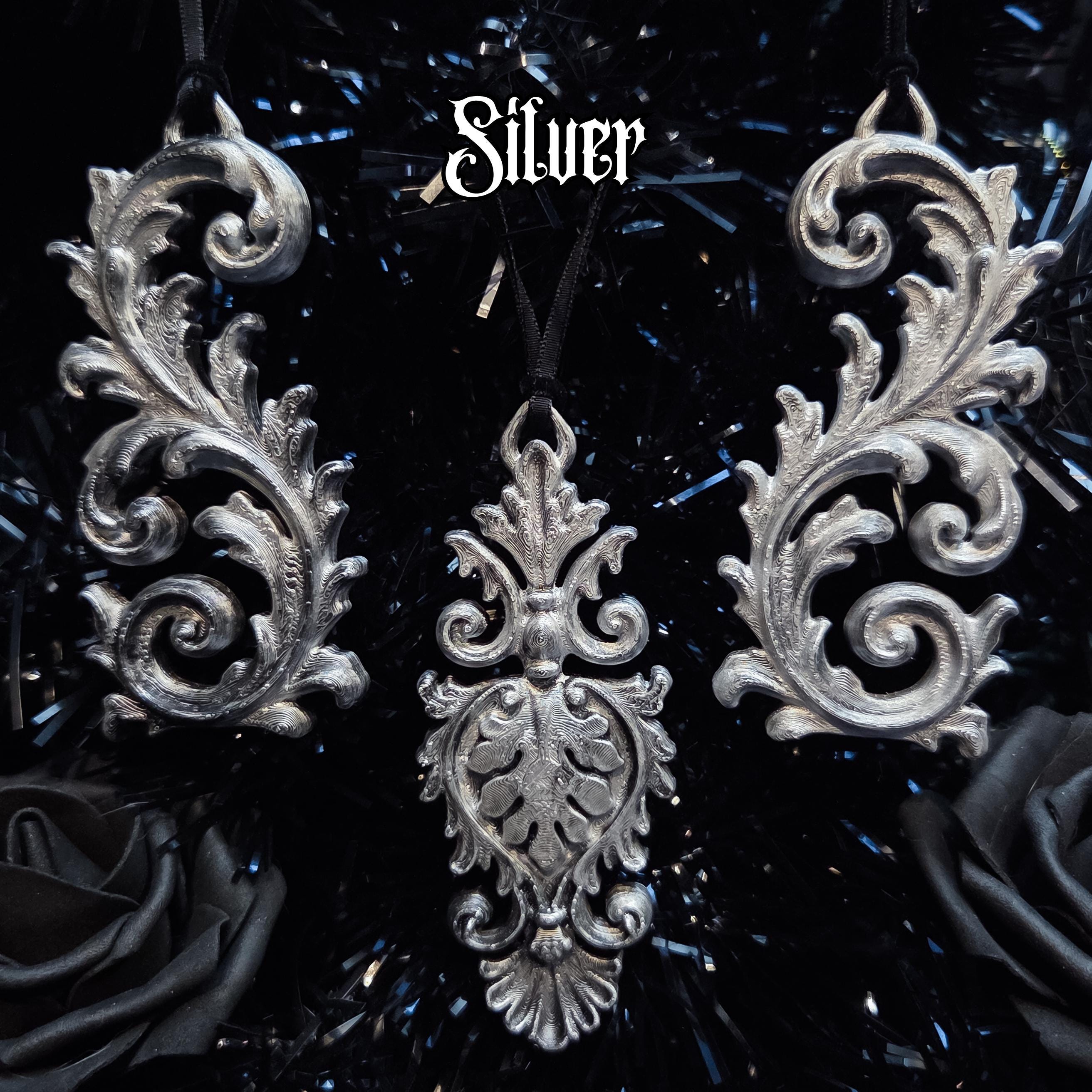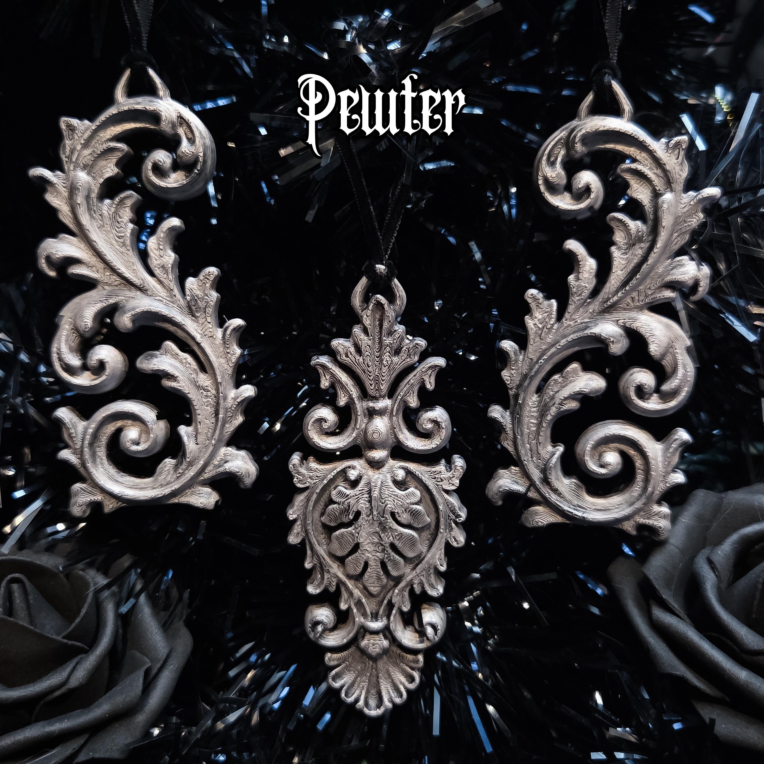 Add a touch of classic Victorian charm to your holiday decor with these filigree ornaments. Inspired by traditional 19th-century patterns, each piece captures the graceful curves that once adorned parlours, jewellery, and keepsakes of the era. The filigree is hand-painted in your choice of antiqued silver, gold, or pewter, giving the ornament a subtle aged finish, the kind that feels perfectly at home on a Christmas tree or resting among your favourite gothic treasures. Finished with a black velvet ribbon, it’s a simple yet striking accent for anyone who appreciates timeless design with a slightly darker edge.