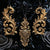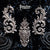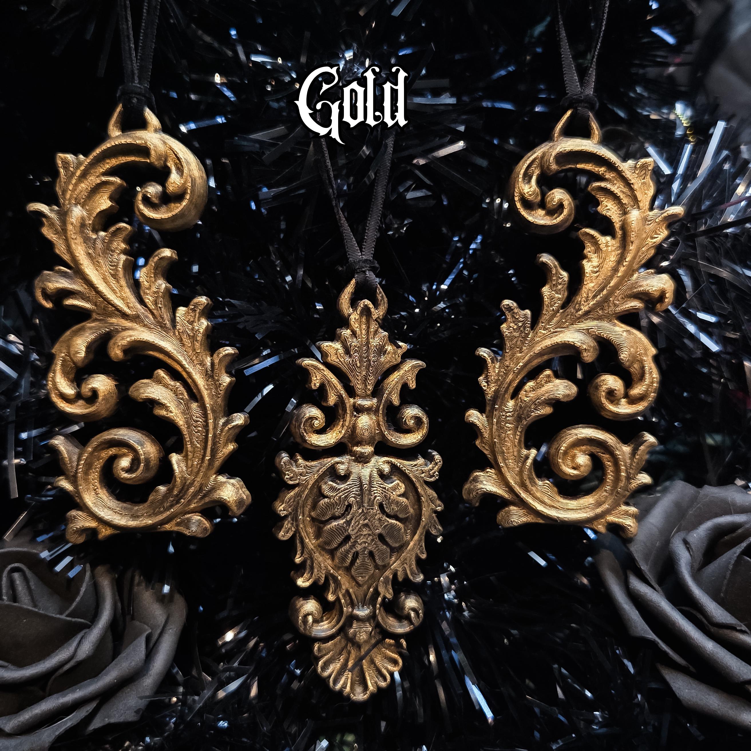 The filigree ornaments are 2.0 x 4.3 x 0.4 inches (50x108x10mm) and 1.7 x 4.3 x 0.5 inches (44x108x12mm) for the two styles, and come ready to hang with a velvet ribbon. They are 3D printed in black or crimson, and then hand-painted in your choice of antiqued finish.