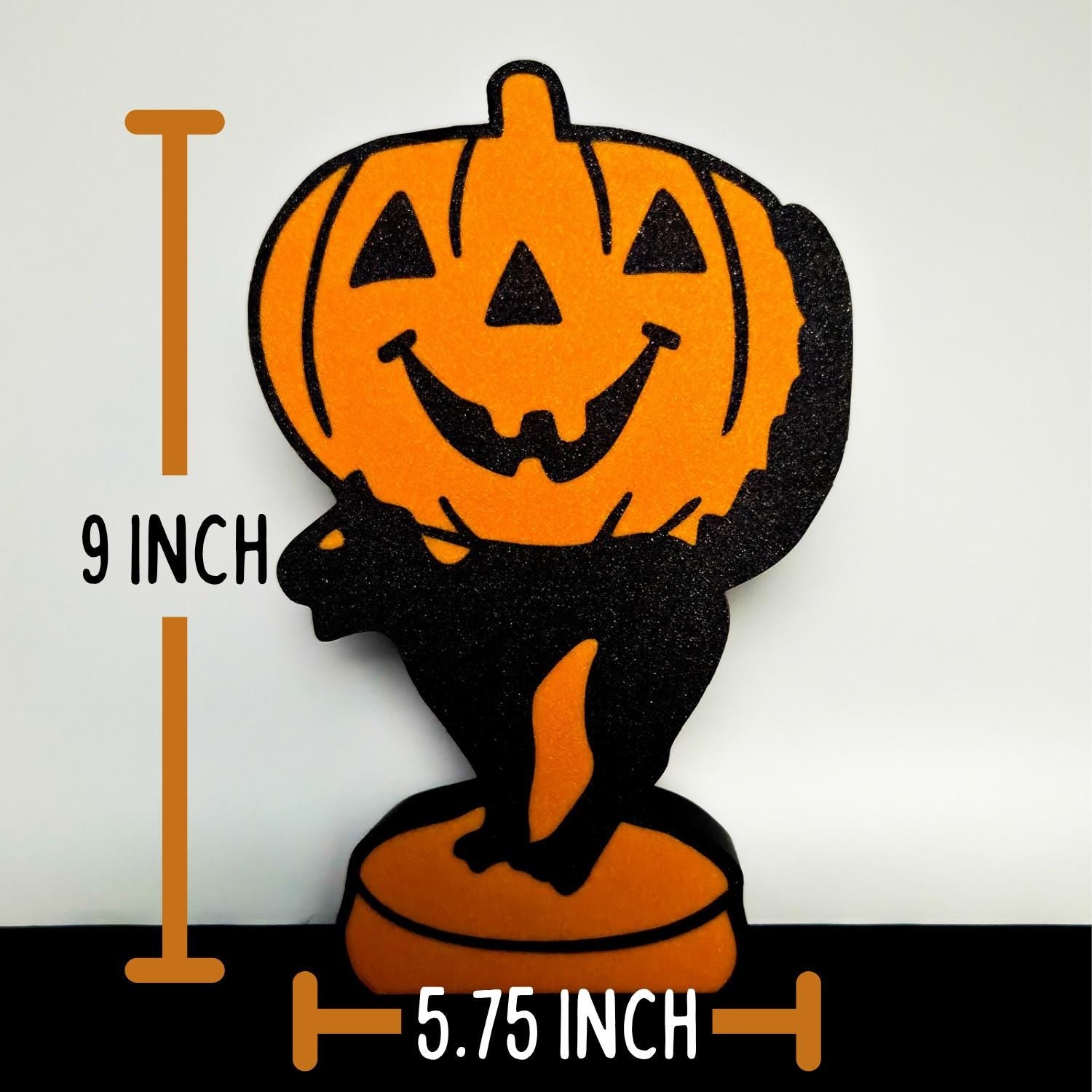 Bring some spooky charm into your home with this vintage-style Halloween lamp. Modeled after a classic Halloween blow-mold design and inspired by Beistle-style art, this lamp features a black cat using a jack-o-lantern as a grooming post. Illuminate your space and add a whimsical touch of nostalgia to your spooky celebrations!