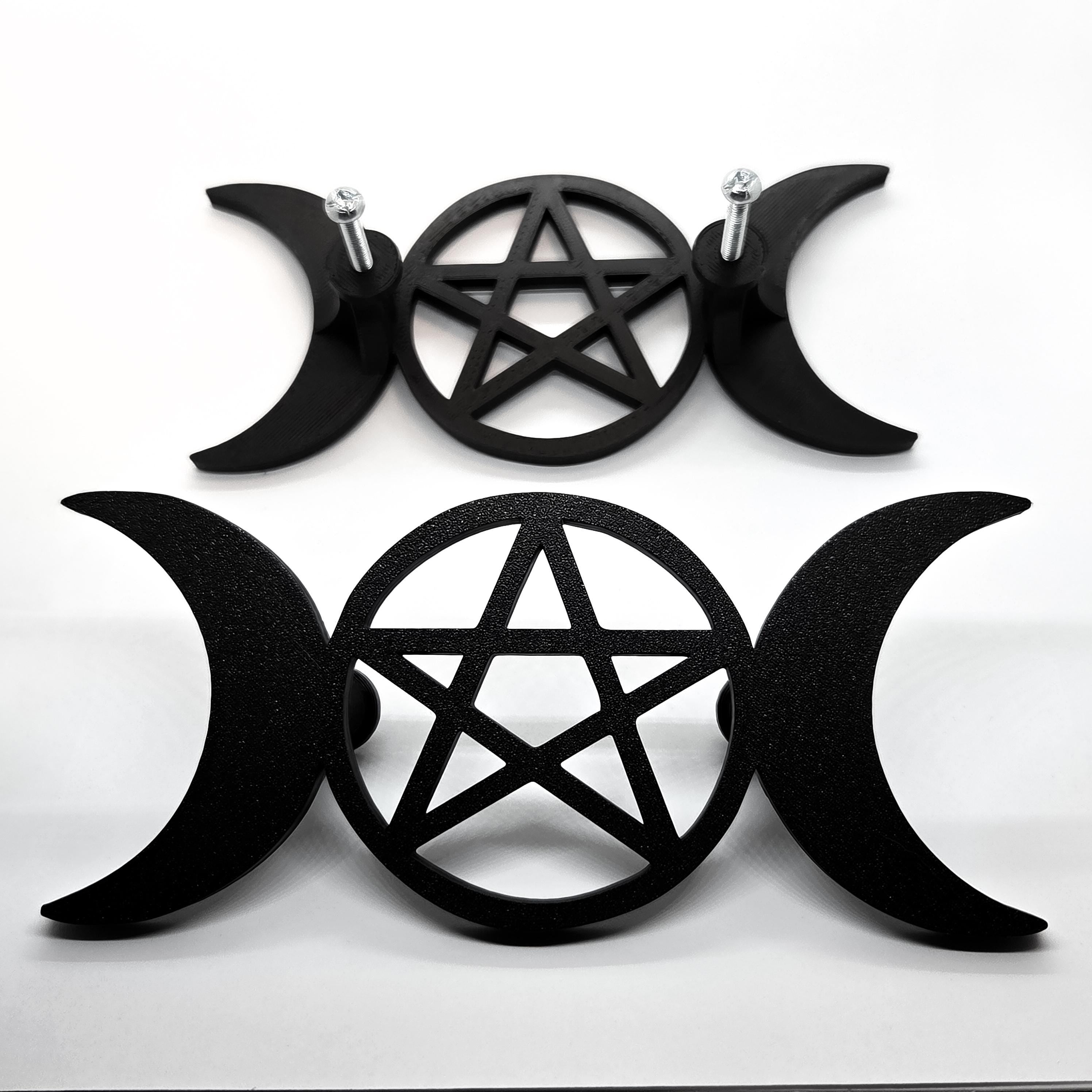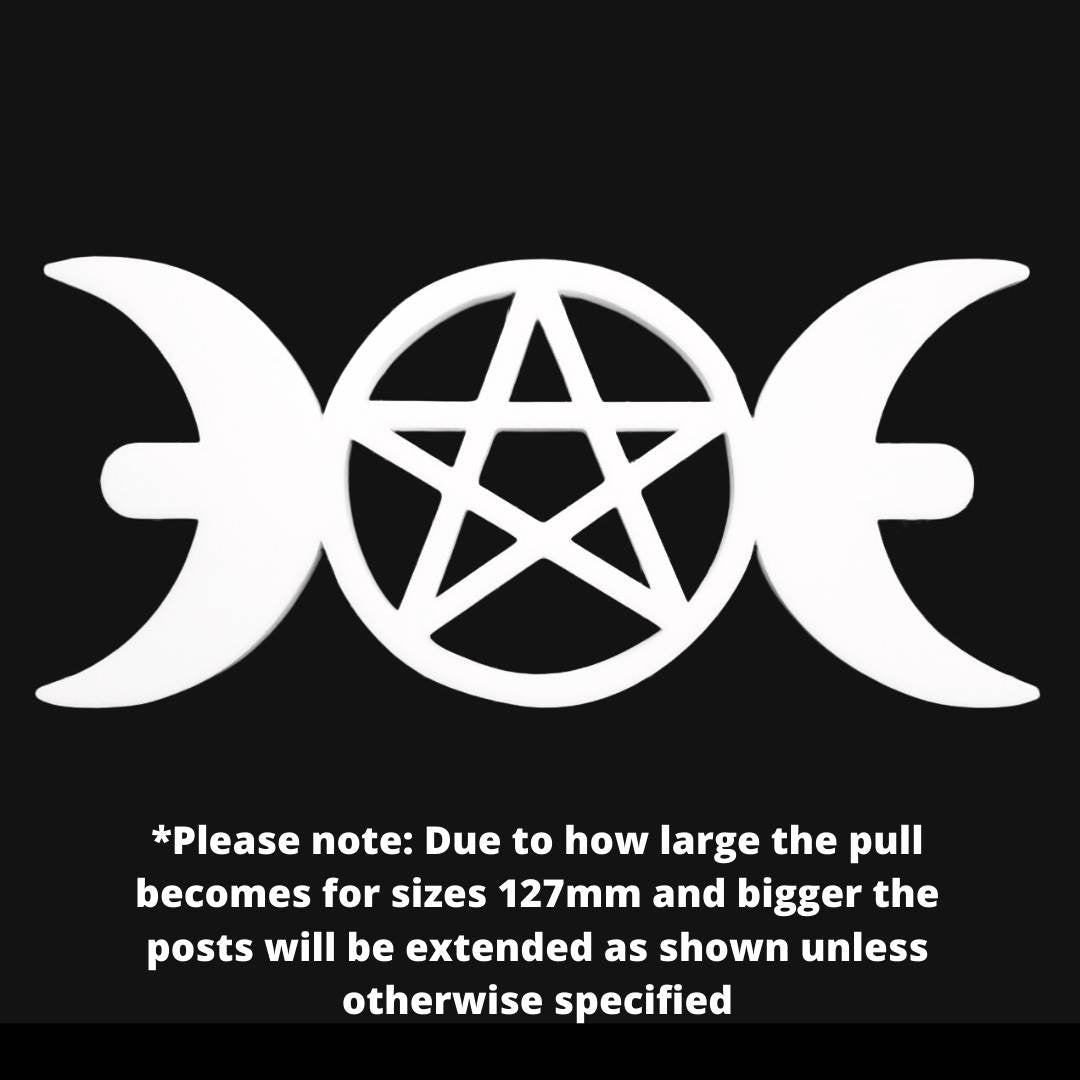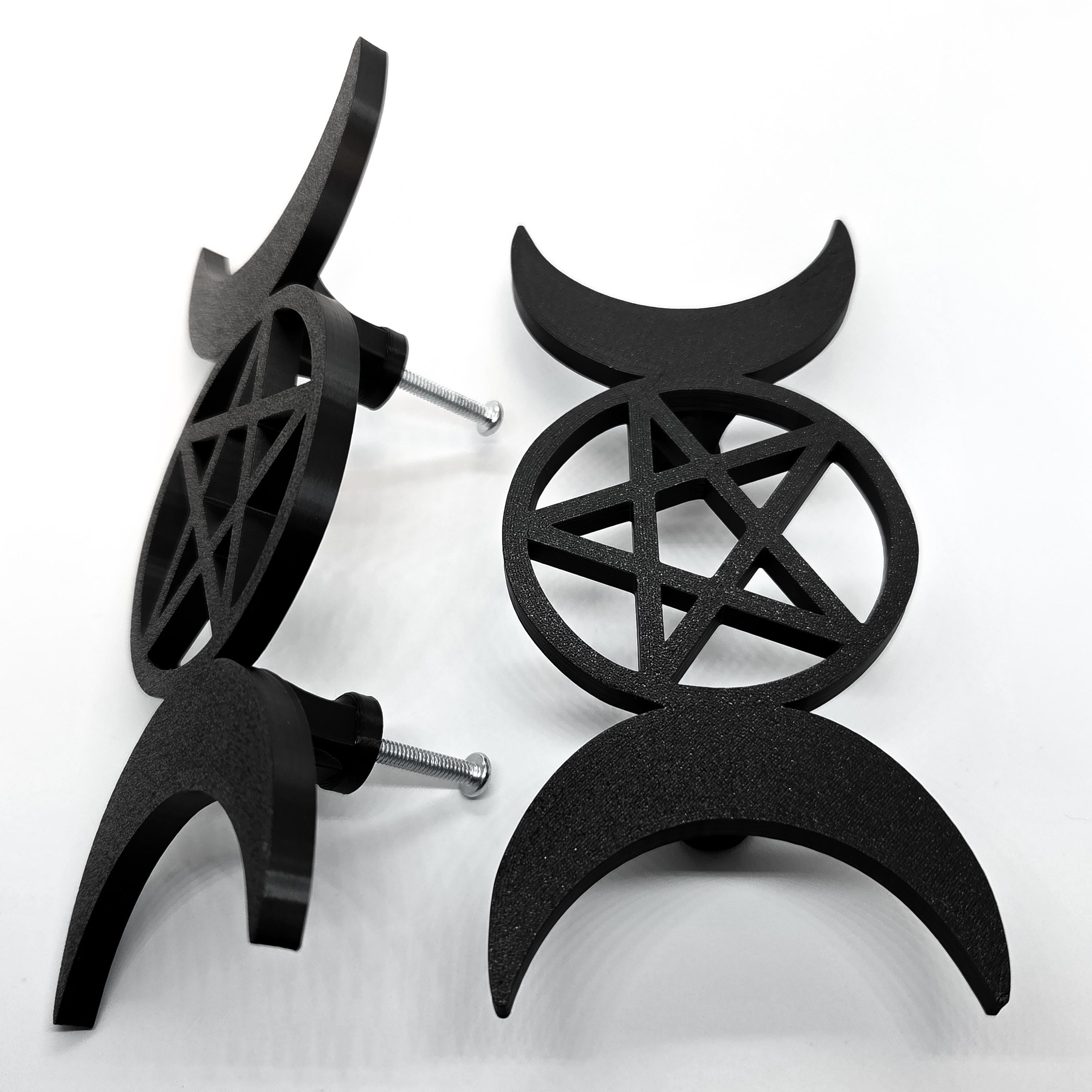Dresser and cabinet hardware is usually very basic and boring, but it doesn't have to be! With our Triple Goddess Moon Drawer Pulls you can keep it witchy while gathering your special ingredients from all the drawers, cupboards, cabinets, and chests. Get rid of your run of the mill pulls and adorn your furniture with the Triple Moon Goddess! Depending on your affiliation, the pull can be rotated so the star is facing the way you prefer.
