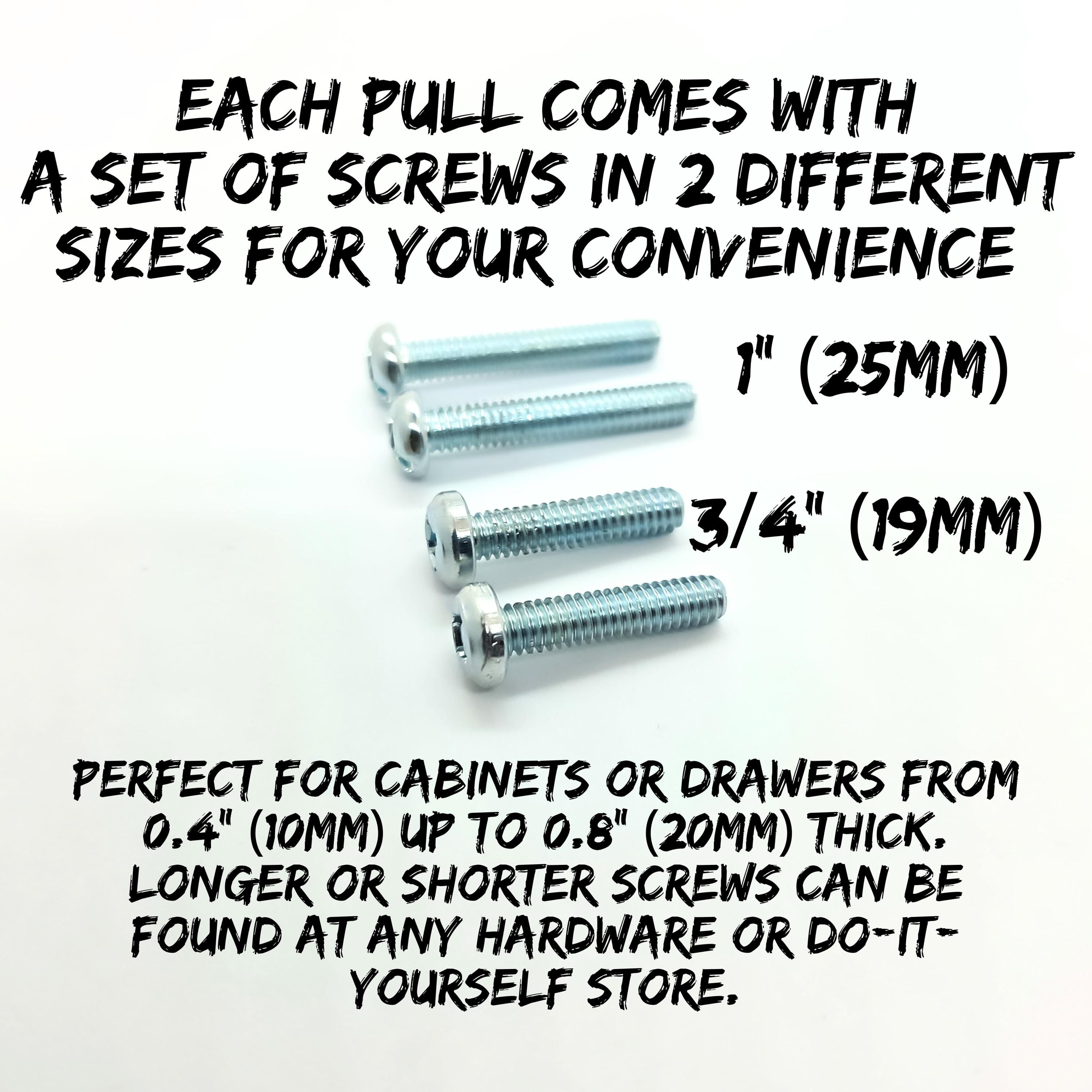 The size of the triple moon goddess drawer pull is approximately 157.7x71.6x29.1mm (6.21 x 2.82 x 1.15 inches) for the 96mm screw center-to-center version and comes with a set of 8-32x3/4 and 8-32x1 inch zinc machine screws for cabinets or drawers from 0.4 up to 0.78 inches thick. The 76mm screw center-to-center version will be slightly smaller in size.